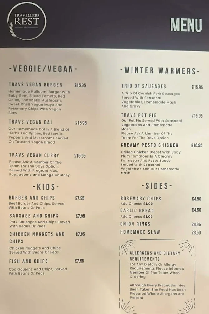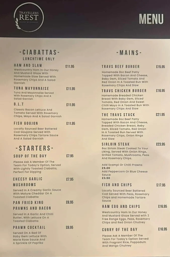 Dining at the Travellers Rest is all about comfort, flavour, and that proper feel good pub experience. This is food thats generous, satisfying, and made to be enjoyed. The menu celebrates classic pub favourites which are inviting and full of flavour. Whether your settling in for a relaxed lunch, a hearty evening meal or our famous Sunday Carvery - this is is the kind of food thats gives you that honest, comforting pub dining experience - done properly, in a place that feels like home.